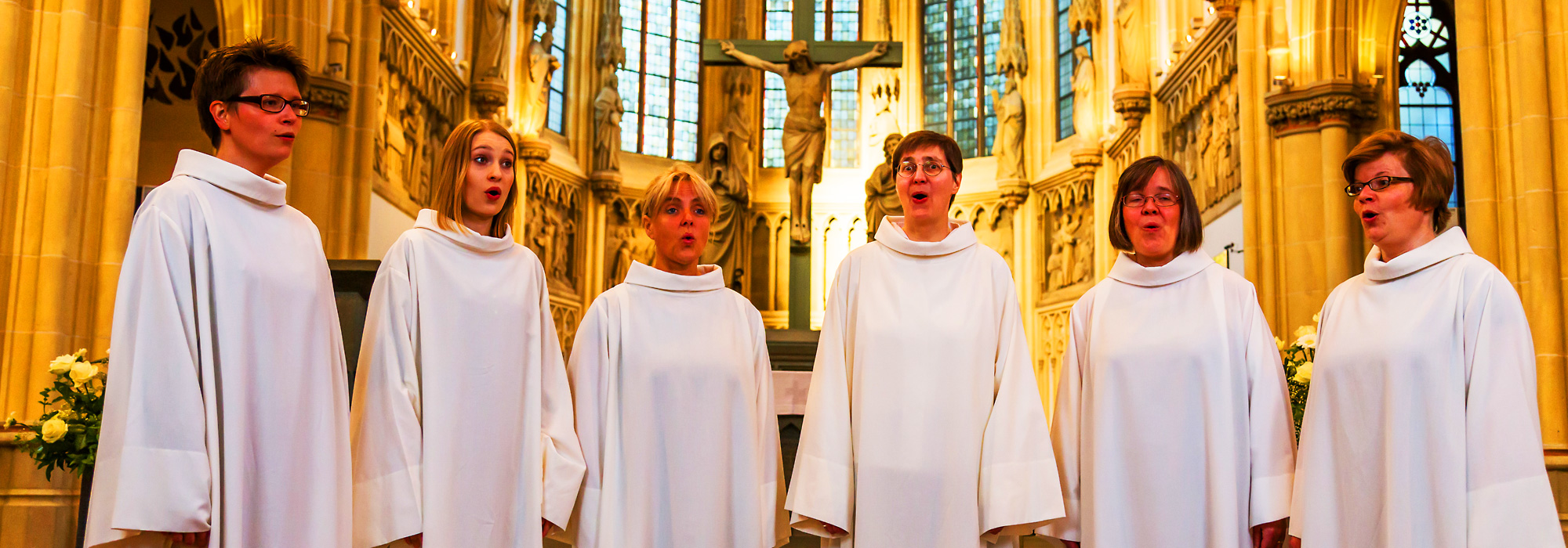 Die Frauen-Schola der Kath. Gemeinde St. Joseph Münster-Süd sagt von sich: Wir singen alles! Und zwar meistens einmal im Monat um 11 Uhr im Gottesdienst am Sonntag in der St.-Joseph-Kirche an der Hammer Straße. Gregorianik, Hildegard von Bingen, das „Engels-Terzett“ von Felix Mendelssohn-Bartholdy. Klein aber rein der Stimmenkreis… Gern wären ein paar Kehlen mehr gesehn!
